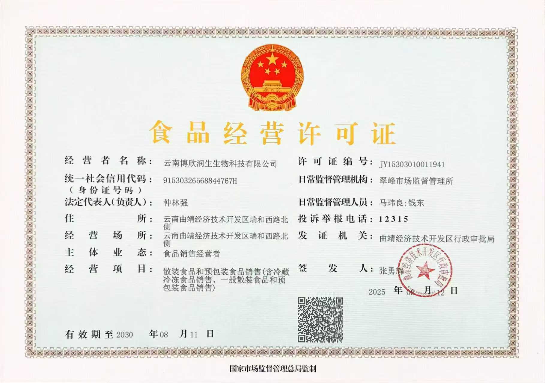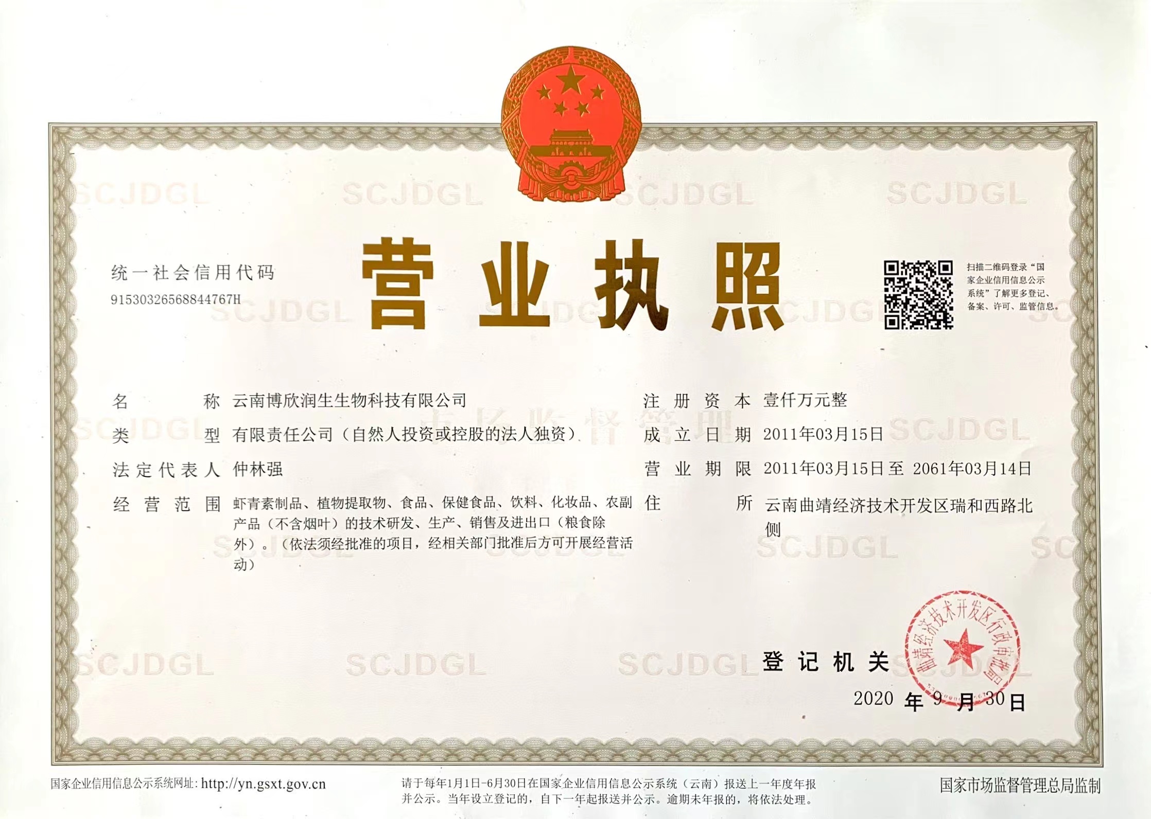 云南博欣润生生物科技有限公司成立于2011年3月15日,注册地址在曲靖经济技术开发区瑞和西路北侧云南博欣生物科技股份有限公司内。