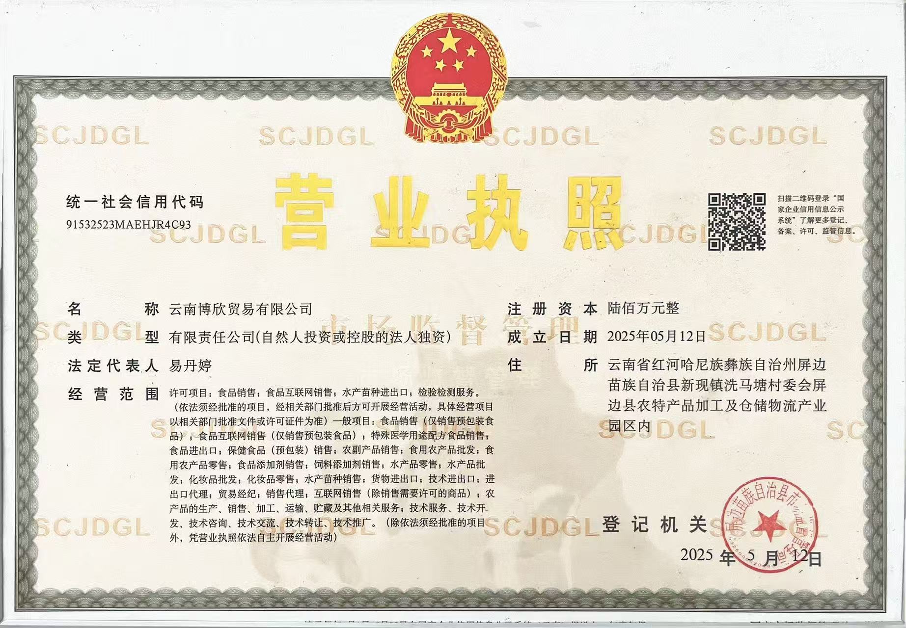云南博欣贸易有限公司成立于2025年5月,座落于云南省红河州屏边苗族自治县新现镇(屏边县农特产品加工及仓储物流产业园区内),全面负责云南博欣集团贸易板块业务。