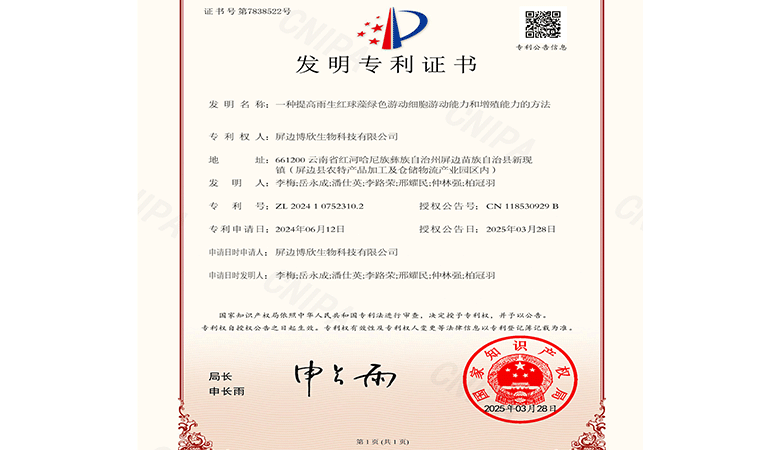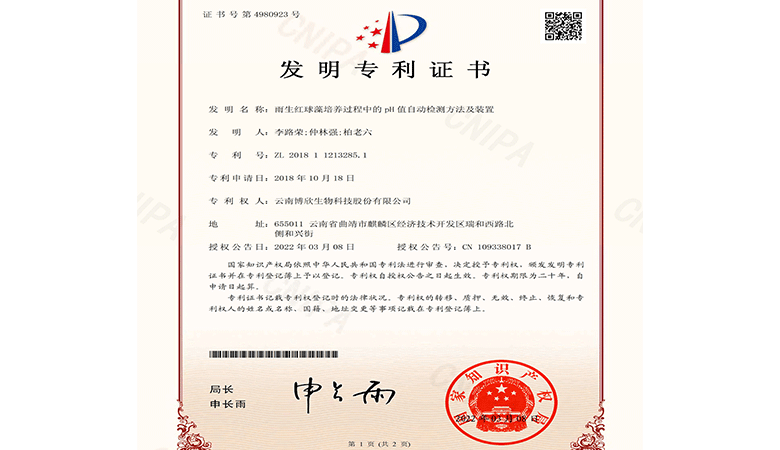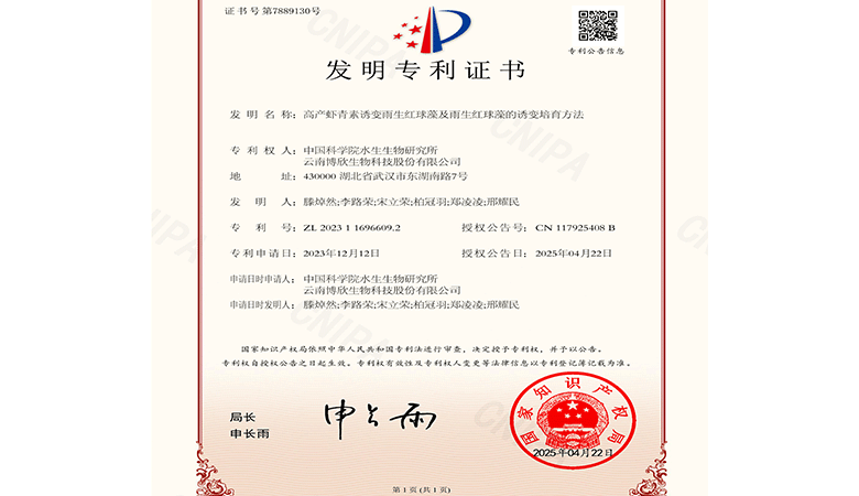 公司与中国科学院水生生物研究所、中国水产科学研究院黄海水产研究所合作,建立了“企业技术中心”、“专家工作站”,构建起了一个完整的技术支撑体系,选育出优质藻种47株,取得76项关键核心技术成果和20多项国家专利,参与了雨生红球藻粉、虾青素油国家标准修订、编制工作,为产业的发展提供了强大的技术保障。